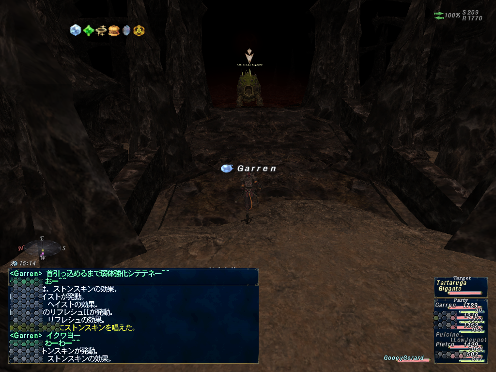 作戦は簡単。首を出しているときは私とジェラルドが殴る。魔道士勢はMP回復に努める。首を引っ込めたらブリザジャ、ブリザドV、ブリザドIV、ブリザドIIIをぶち込んで首を引っ張り出す。この繰り返し。敵のサイレガにはやまびこ薬を飲む。タゲはほとんどジェラルドなので、ウォタガIVの範囲に入らないように気をつける。たまに私ぎゃれんが巻き込まれてたけど^^