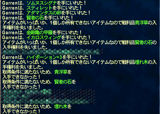 ご覧頂こう。1戦目で「アダマンタスの卵」を引き当てたのである!ヤッター!だが2枚目の画像に注目!慟哭の谷でHNMアダマンタスをポップさせるためのトリガーアイテム「青浮草」が、カバンがいっぱいで流れているのである!卵が手に入ったから青浮草は売れば良いのであるが、これは1個70万ギルくらいするのである!