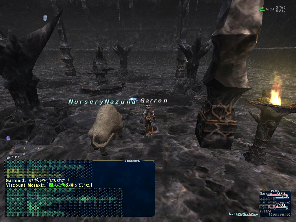 それからしりさんとNM狩りにズヴァール城内郭に行く。Count Bifronsは沸かなかったけど、召喚NMの方は沸いたらしいのでしりさんがトレハン乗せて倒すも魔人の角のみ。けちっ。