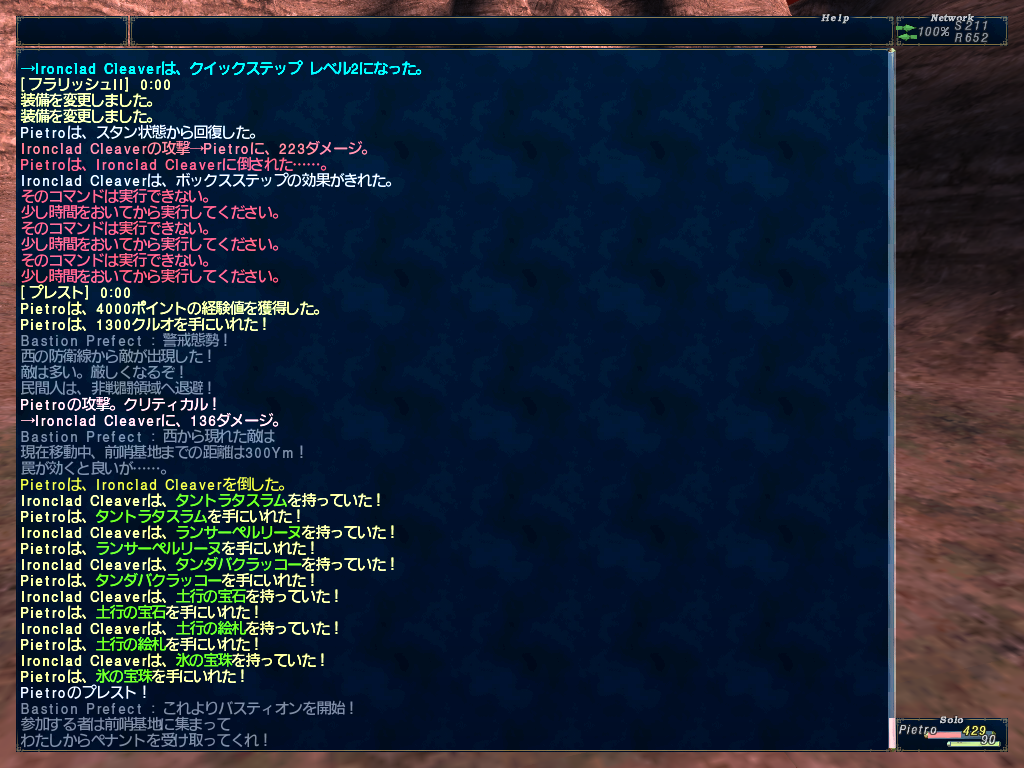 みたいなコンボを食らって昇天。即、終焉のアートマのリレイズIII効果で復活して鉄巨人に襲いかかる、うおー!なんてのを20回くらい死んで、テンポラリも使いまくって何とか勝利。戦闘時間約30分。回避あまりしなくて辛かった。GarrenでLv95くらいでやったときはもっと余裕だったけどなぁ。やはり回避スキルが白いのがダメなのか…。