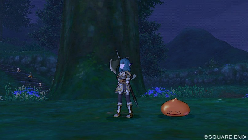 パッシブ育て用の戦士のサブのための武器スキル育て用のレンジャーで歩いてたら、スライムベスが寝てたので横に立って撮影したら目を瞑ってた。